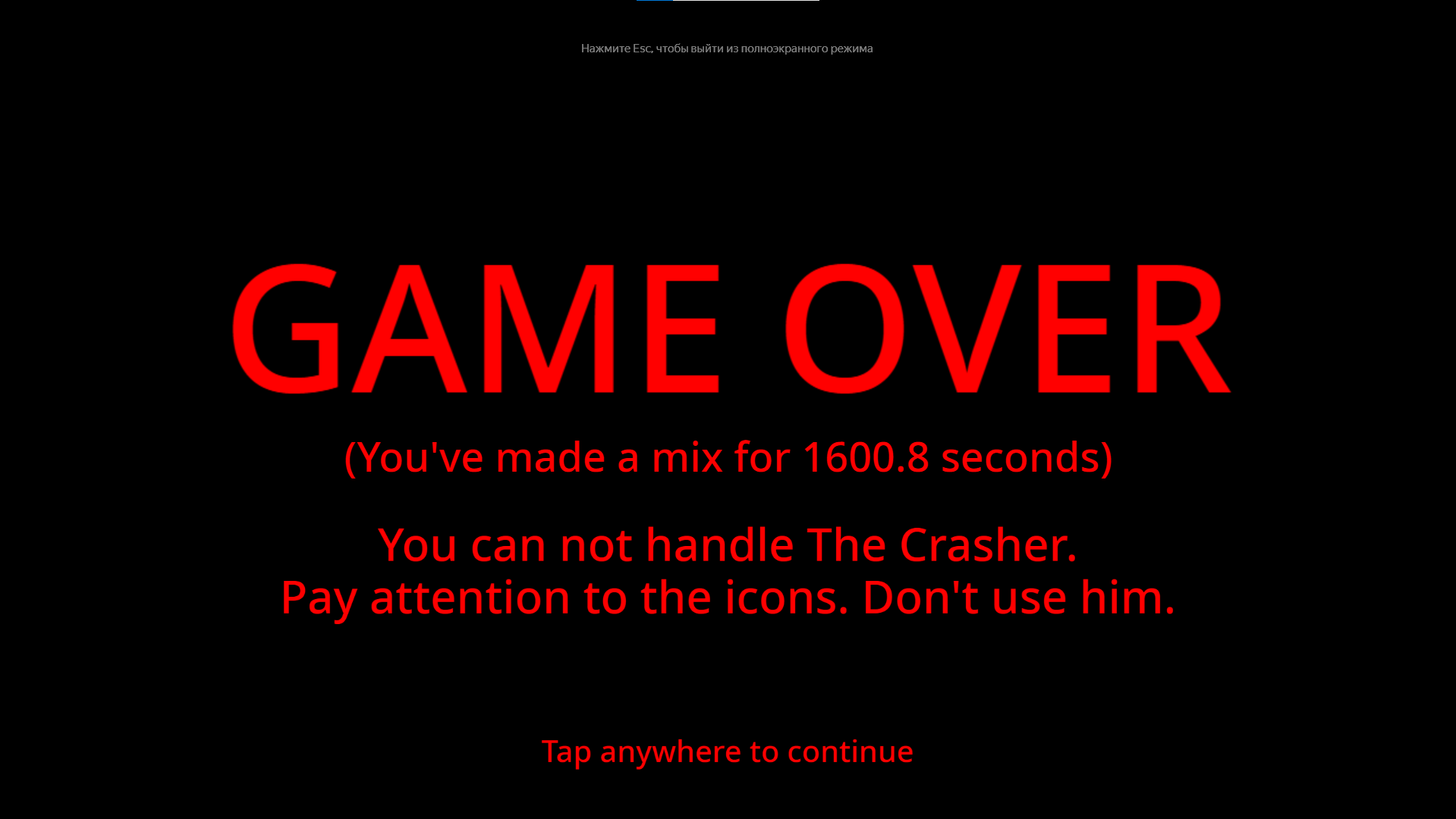 Credit where it's due, the time did pass quickly for that 6 minute mix. A lot of the instruments here are nice, it's a high quality Incredibox package. Getting all achievements unlocks "Mercy" mode, which I'm pretty sure just disables the mechanics so you can play with the instruments the normal way. Crasher still crashes you, though, he has no mercy. Fun fact, I noticed after a while that the buttons on the guys scramble themselves every time you mouse over them, thought I was just being sloppy when I kept clicking something else when trying to click the headphones to isolate the instrument.